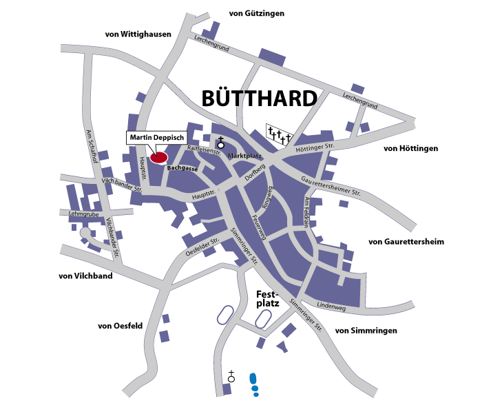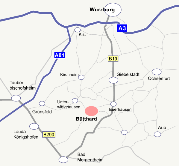 Fahren Sie in Bütthard in die Bachgasse bis zur Hausnummer 18 (grosses, grünes Haus mit gemaltem Weinstock). Der Hofeingang befindet sich nach einer Linkskurve.